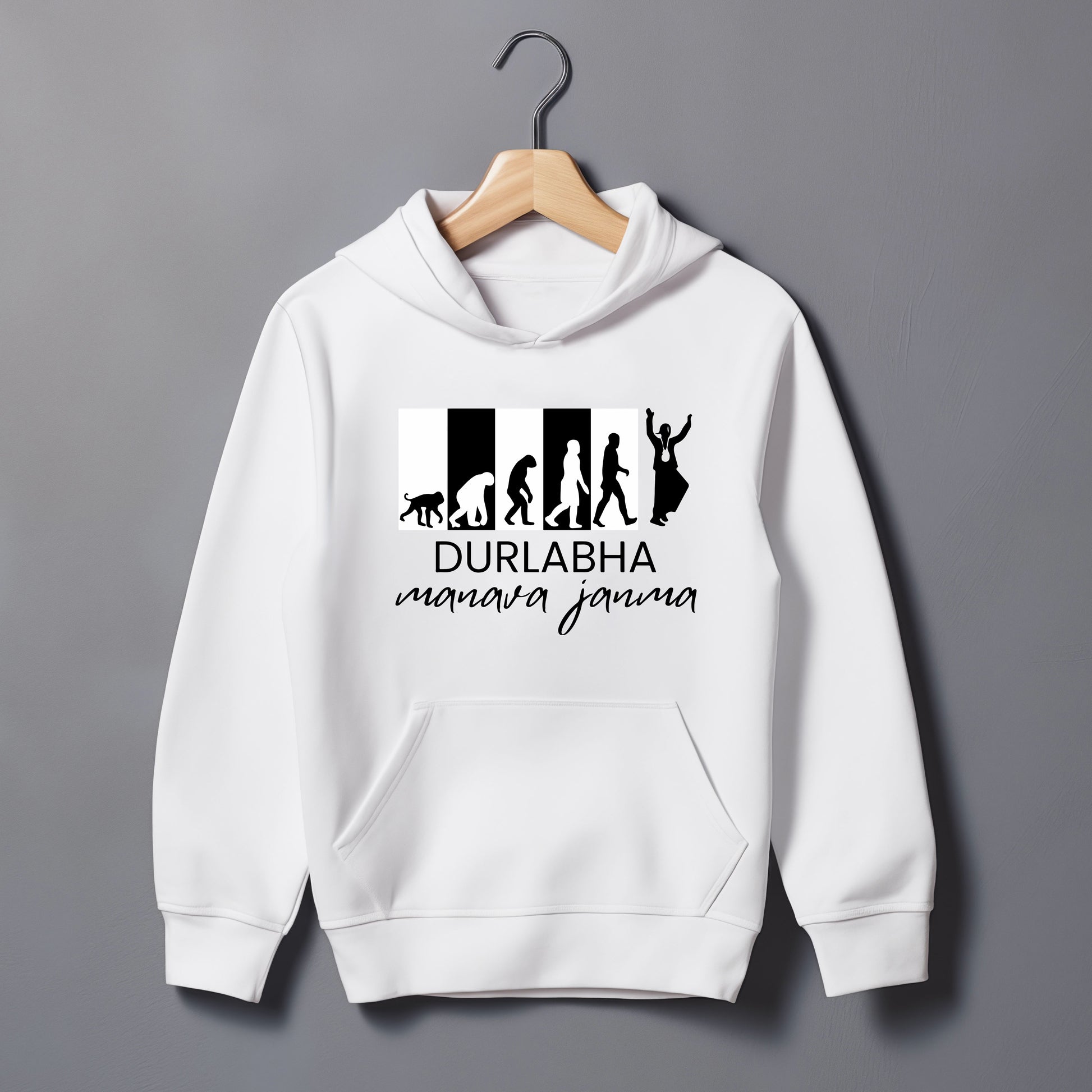 Introducing our premium 100% cotton hoodie, crafted from soft and durable 320 GSM fabric for ultimate comfort and longevity. This classic-fit hoodie features a devotional theme with the inspiring phrase, "Durlabha Manava Janma," reminding us that human life is rare and should be cherished through devotion. Perfect for everyday wear, spiritual gatherings, or meditation, this t-shirt blends comfort with a meaningful message. Whether for casual wear or spiritual gatherings, this hoodie seamlessly blends comfort with faith, making it a meaningful and stylish addition to your wardrobe. Embrace your spirituality with warmth and grace in this unique devotional hoodie.